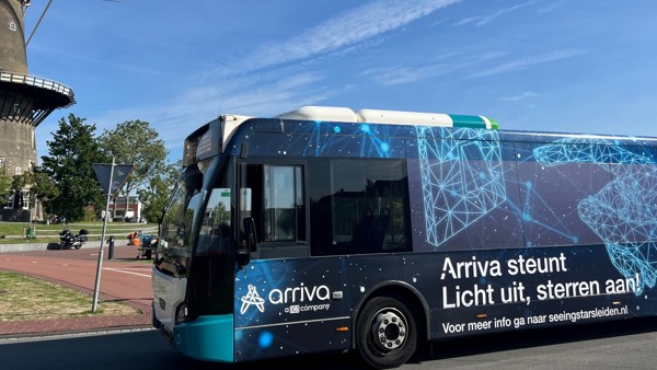 Een bestickerde Arriva bus rijdt door de regio om de Leidenaars op deze avond te vragen de lichten uit te doen en te genieten van de sterren. Tijdens het event rijden onze bussen een andere route, om de binnenstad zo donker mogelijk te houden.